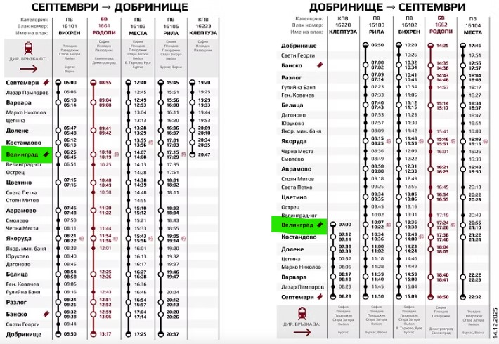 ОНЛАЙН РАЗПИСАНИЕ на теснолинейката (то е най-точно). Ако ще пътувате от Велинград към Септември в онлайн разписанието търсете часовете на тръгване от гара Велинград в "Добринище->Септември" - вертикално са описани разписанията на 7-те влака в тази посока: